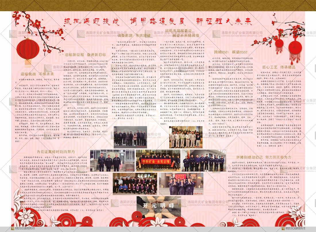 洛陽開元礦業(yè)集團(tuán)有限公司簡介洛陽開元礦業(yè)集團(tuán)有限公司,始成立于2006年,位于洛陽市開元大道269號。集團(tuán)旗下共有五余家全資子公司,業(yè)務(wù)涉及有色金屬礦山開發(fā)、礦產(chǎn)品購銷與進(jìn)出口貿(mào)易、房地產(chǎn)開發(fā)、文化藝術(shù)、企業(yè)管理與咨詢、資本投資等多個(gè)領(lǐng)域。民建河南省委委員、民建河南省委企業(yè)委副主任、民建洛陽市委委員、企業(yè)委主任、洛陽民建企業(yè)家協(xié)會(huì)會(huì)長許明月是公司創(chuàng)始人,現(xiàn)任洛陽開元礦業(yè)集團(tuán)有限公司董事長。在礦業(yè)領(lǐng)域,洛陽開元礦業(yè)集團(tuán)擁有多家實(shí)力雄厚的子公司:貴州開元礦業(yè)有限公司探、采礦權(quán)面積共11.33平方公里;興海縣銅鑫礦業(yè)有限公司探礦權(quán)面積8.76平方公里,礦山資源潛力巨大;2021年,開元集團(tuán)與盧氏中科礦業(yè)有限公司開展戰(zhàn)略合作。盧氏中科礦業(yè)有限公司專注于有色金屬的浮選、加工和銷售,擁有強(qiáng)大的技術(shù)支撐平臺,是集探、采、選、冶、研為一體的中大型綜合礦業(yè)企業(yè)。目前,盧氏中科王家河1000噸選礦廠已成功投產(chǎn),雙河金礦、柳關(guān)欒盧鉛鋅礦相繼順利開工,樓房銀礦與圪老灣鉛鋅礦的深部探礦重大突破,標(biāo)志著礦山版圖取得重大進(jìn)展,為開元集團(tuán)后續(xù)發(fā)展奠定了堅(jiān)實(shí)基礎(chǔ)。在文化傳媒領(lǐng)域,洛陽市明月美術(shù)館通過豐富多樣的藝術(shù)展覽、學(xué)術(shù)研討和公共教育活動(dòng),努力打造一個(gè)集展覽、交流、教育、研究為一體的綜合性藝術(shù)平臺。此外,在金融投資領(lǐng)域,開元集團(tuán)旗下的北京明峰資本管理有限公司專注于投資具有高增長潛力的優(yōu)秀企業(yè),特別是高科技、新能源、環(huán)保等新興產(chǎn)業(yè),為客戶提供個(gè)性化的資產(chǎn)配置服務(wù)。在做好企業(yè)經(jīng)營的同時(shí),開元集團(tuán)始終不忘企業(yè)的社會(huì)責(zé)任和家國情懷,以突出的愛心公益事跡,開展了一系列公益慈善活動(dòng):“民建林”公益事業(yè)通過“思源基金”“幫幫公益”線上公益平臺,與眾多愛心人士籌措資金20余萬元;資助541名貧困大學(xué)生共計(jì)270余萬元,推進(jìn)“數(shù)字助力——河南AI人才培養(yǎng)”;捐款10萬元,馳援京津冀、黑龍江洪水地質(zhì)災(zāi)害……公司于2017年底被洛陽市慈善總會(huì)評為“洛陽慈善風(fēng)云榜——十大愛心集體”。洛陽開元礦業(yè)集團(tuán)有限公司秉承持續(xù)發(fā)展理念,憑借多年來良好的企業(yè)信譽(yù)與經(jīng)營業(yè)績,與全國多家企業(yè)建立了良好合作關(guān)系,受到社會(huì)各界的一致好評,多次榮獲“納稅標(biāo)兵”“先進(jìn)企業(yè)”“招商引資模范企業(yè)”等榮譽(yù)稱號?;赝麃頃r(shí)路,開元人勠力同心,以“闖”的精神和“創(chuàng)”的勁頭,一路披荊斬棘,踏過千山萬水;展望新未來,開元人凝心聚力,不執(zhí)于“舊”,無畏于“新”,秉承“勇于跨越,追求卓越”的企業(yè)精神,乘著國家高質(zhì)量發(fā)展新征程的東風(fēng),跨過高山,越過大海,向著集團(tuán)多元化、國際化的目標(biāo),逐夢遠(yuǎn)航,跨越前行!