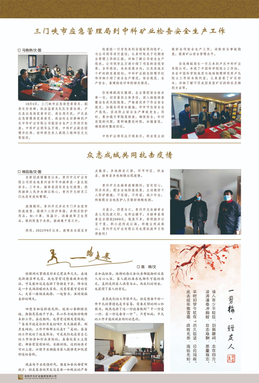 洛陽開元礦業(yè)集團(tuán)有限公司簡介洛陽開元礦業(yè)集團(tuán)有限公司,始成立于2006年,位于洛陽市開元大道269號(hào)。集團(tuán)旗下共有五余家全資子公司,業(yè)務(wù)涉及有色金屬礦山開發(fā)、礦產(chǎn)品購銷與進(jìn)出口貿(mào)易、房地產(chǎn)開發(fā)、文化藝術(shù)、企業(yè)管理與咨詢、資本投資等多個(gè)領(lǐng)域。民建河南省委委員、民建河南省委企業(yè)委副主任、民建洛陽市委委員、企業(yè)委主任、洛陽民建企業(yè)家協(xié)會(huì)會(huì)長許明月是公司創(chuàng)始人,現(xiàn)任洛陽開元礦業(yè)集團(tuán)有限公司董事長。在礦業(yè)領(lǐng)域,洛陽開元礦業(yè)集團(tuán)擁有多家實(shí)力雄厚的子公司:貴州開元礦業(yè)有限公司探、采礦權(quán)面積共11.33平方公里;興??h銅鑫礦業(yè)有限公司探礦權(quán)面積8.76平方公里,礦山資源潛力巨大;2021年,開元集團(tuán)與盧氏中科礦業(yè)有限公司開展戰(zhàn)略合作。盧氏中科礦業(yè)有限公司專注于有色金屬的浮選、加工和銷售,擁有強(qiáng)大的技術(shù)支撐平臺(tái),是集探、采、選、冶、研為一體的中大型綜合礦業(yè)企業(yè)。目前,盧氏中科王家河1000噸選礦廠已成功投產(chǎn),雙河金礦、柳關(guān)欒盧鉛鋅礦相繼順利開工,樓房銀礦與圪老灣鉛鋅礦的深部探礦重大突破,標(biāo)志著礦山版圖取得重大進(jìn)展,為開元集團(tuán)后續(xù)發(fā)展奠定了堅(jiān)實(shí)基礎(chǔ)。在文化傳媒領(lǐng)域,洛陽市明月美術(shù)館通過豐富多樣的藝術(shù)展覽、學(xué)術(shù)研討和公共教育活動(dòng),努力打造一個(gè)集展覽、交流、教育、研究為一體的綜合性藝術(shù)平臺(tái)。此外,在金融投資領(lǐng)域,開元集團(tuán)旗下的北京明峰資本管理有限公司專注于投資具有高增長潛力的優(yōu)秀企業(yè),特別是高科技、新能源、環(huán)保等新興產(chǎn)業(yè),為客戶提供個(gè)性化的資產(chǎn)配置服務(wù)。在做好企業(yè)經(jīng)營的同時(shí),開元集團(tuán)始終不忘企業(yè)的社會(huì)責(zé)任和家國情懷,以突出的愛心公益事跡,開展了一系列公益慈善活動(dòng):“民建林”公益事業(yè)通過“思源基金”“幫幫公益”線上公益平臺(tái),與眾多愛心人士籌措資金20余萬元;資助541名貧困大學(xué)生共計(jì)270余萬元,推進(jìn)“數(shù)字助力——河南AI人才培養(yǎng)”;捐款10萬元,馳援京津冀、黑龍江洪水地質(zhì)災(zāi)害……公司于2017年底被洛陽市慈善總會(huì)評(píng)為“洛陽慈善風(fēng)云榜——十大愛心集體”。洛陽開元礦業(yè)集團(tuán)有限公司秉承持續(xù)發(fā)展理念,憑借多年來良好的企業(yè)信譽(yù)與經(jīng)營業(yè)績,與全國多家企業(yè)建立了良好合作關(guān)系,受到社會(huì)各界的一致好評(píng),多次榮獲“納稅標(biāo)兵”“先進(jìn)企業(yè)”“招商引資模范企業(yè)”等榮譽(yù)稱號(hào)?;赝麃頃r(shí)路,開元人勠力同心,以“闖”的精神和“創(chuàng)”的勁頭,一路披荊斬棘,踏過千山萬水;展望新未來,開元人凝心聚力,不執(zhí)于“舊”,無畏于“新”,秉承“勇于跨越,追求卓越”的企業(yè)精神,乘著國家高質(zhì)量發(fā)展新征程的東風(fēng),跨過高山,越過大海,向著集團(tuán)多元化、國際化的目標(biāo),逐夢遠(yuǎn)航,跨越前行!
